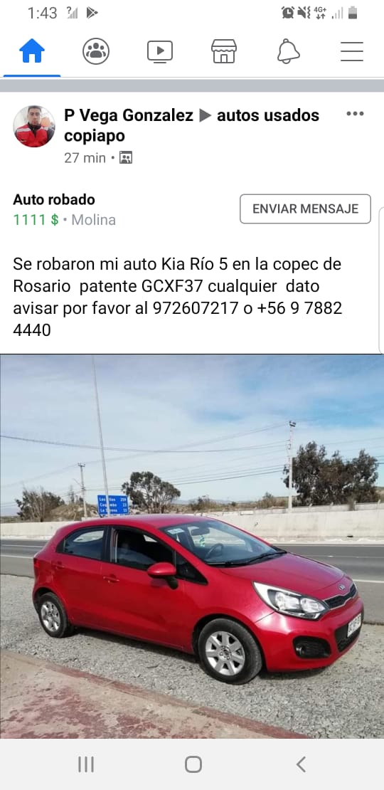 En el lugar, fueron solicitados mediante señas por un ciudadano quien les relató que siendo las 00:30 horas aproximadamente concurrió hasta el servicentro Copec de Rosario, lugar en el cual fue abordado por dos sujetos mediante la intimidación con arma blanca, quienes le sustrajeron su automóvil marca kia modelo Río de color rojo, debido a lo anterior y después de haber realizado la denuncia en la 2da. Comisaría de Carabineros de Copiapó, publicó los hechos en las redes sociales , recibiendo respuesta mediante mensajería de texto indicando que su automóvil se encontraba en el sector de las tomas de Andacollo.