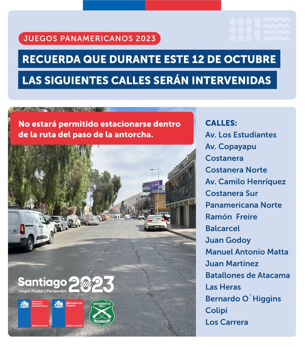 Las calles que este jueves 12 de octubre suspenderán temporalmente el tráfico de vehículos, para dar paso a los deportistas que realizarán el relevo son las siguientes, en este orden de ruta: Calle Los Estudiantes (a un costado del Estadio Luis Valenzuela Hermosilla) a las 10:00 de la mañana, para seguir por Avenida Copayapu hasta el siguiente relevo que será en la intersección con Calle Vicuña. Posteriormente se sigue hasta Avenida Henríquez, donde se gira hacia el sector de la calle Costanera en el Parque Kaukari. Desde ahí el desplazamiento de la actividad sigue hasta el sector Entre Puentes y la Plaza de la Bandera. Los relevistas continuarán ruta por Av. Copayapu hasta Chacabuco, continuando por Ramón Freire hasta Rancagua, siguiendo hasta el Centro Cultural Atacama desde donde se desplazarán hasta la Estación de Trenes en Juan Martínez con Batallón Atacama. Los relevistas seguirán la actividad hasta la Calle Las Heras con Blanco, casi esquina con la Alameda. Luego continuarán ruta por la Alameda hasta la Avenida Atacama, desde donde se desplazarán hasta O’Higgins con Rancagua, siguiendo el camino hasta la Plaza de Armas de Copiapó. Será en el centro de la ciudad, donde se encenderá el fuego de los Juegos Panamericanos y Parapanamericanos Santiago 2023 en el corazón de Copiapó.
