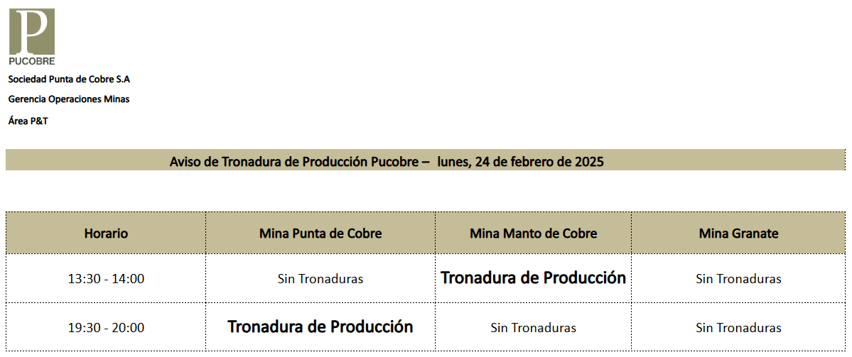AVISO DE TRONADURAS DE PRODUCCIÓN PUCOBRE / LUNES 24 DE FEBRERO DE 2025