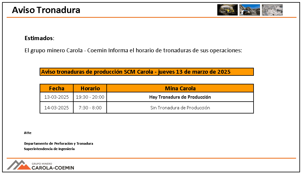 AVISO DE TRONADURAS DE PRODUCCIÓN SCM CAROLA / JUEVES 13 DE MARZO DE 2025
