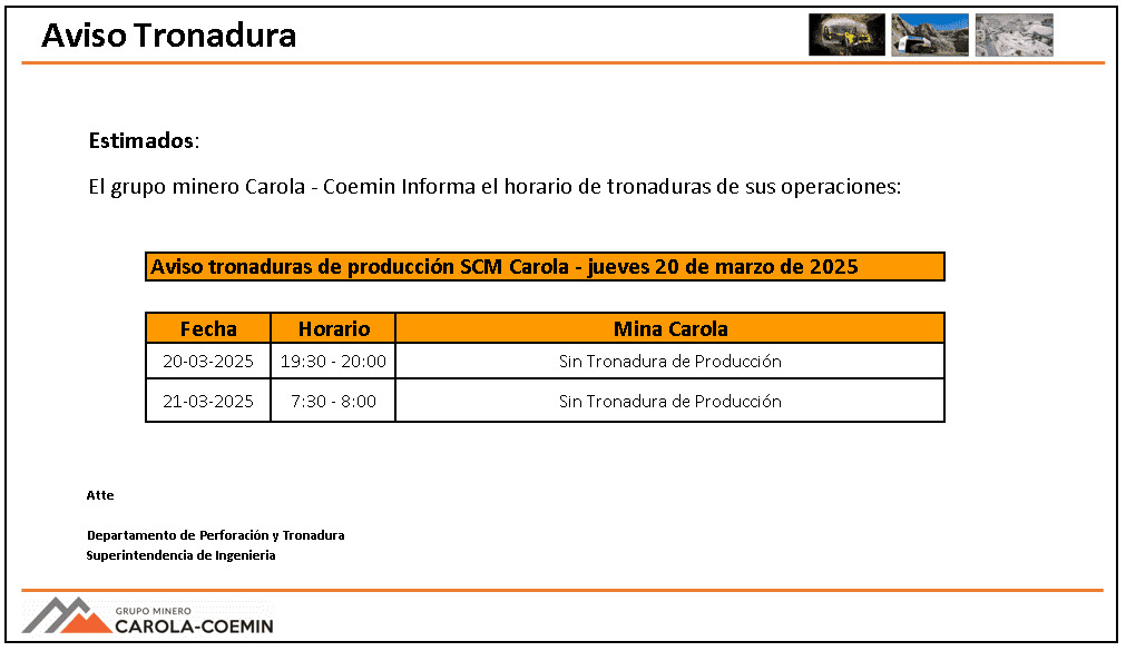 AVISO DE TRONADURAS DE PRODUCCIÓN SCM CAROLA / JUEVES 20 MARZO DE 2025