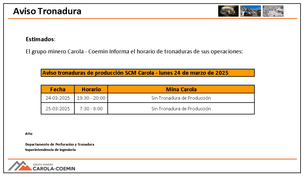 AVISO DE TRONADURAS DE PRODUCCIÓN SCM CAROLA / LUNES 24 DE MARZO DE 2025