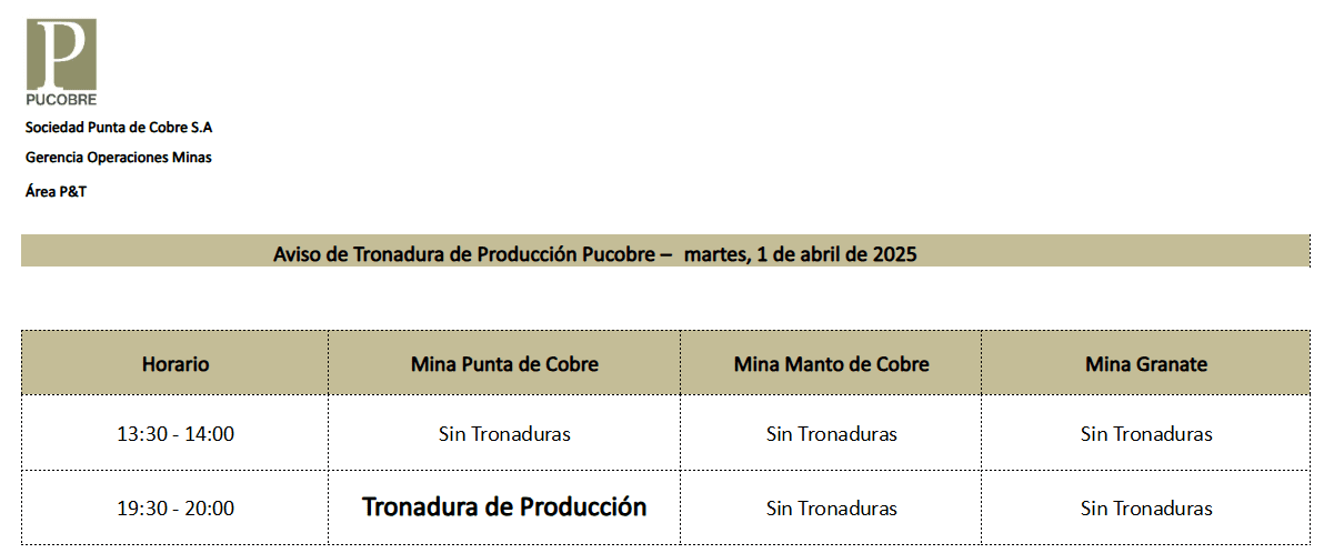 AVISO DE TRONADURAS DE PRODUCCIÓN PUCOBRE / MARTES 1 DE ABRIL DE 2025