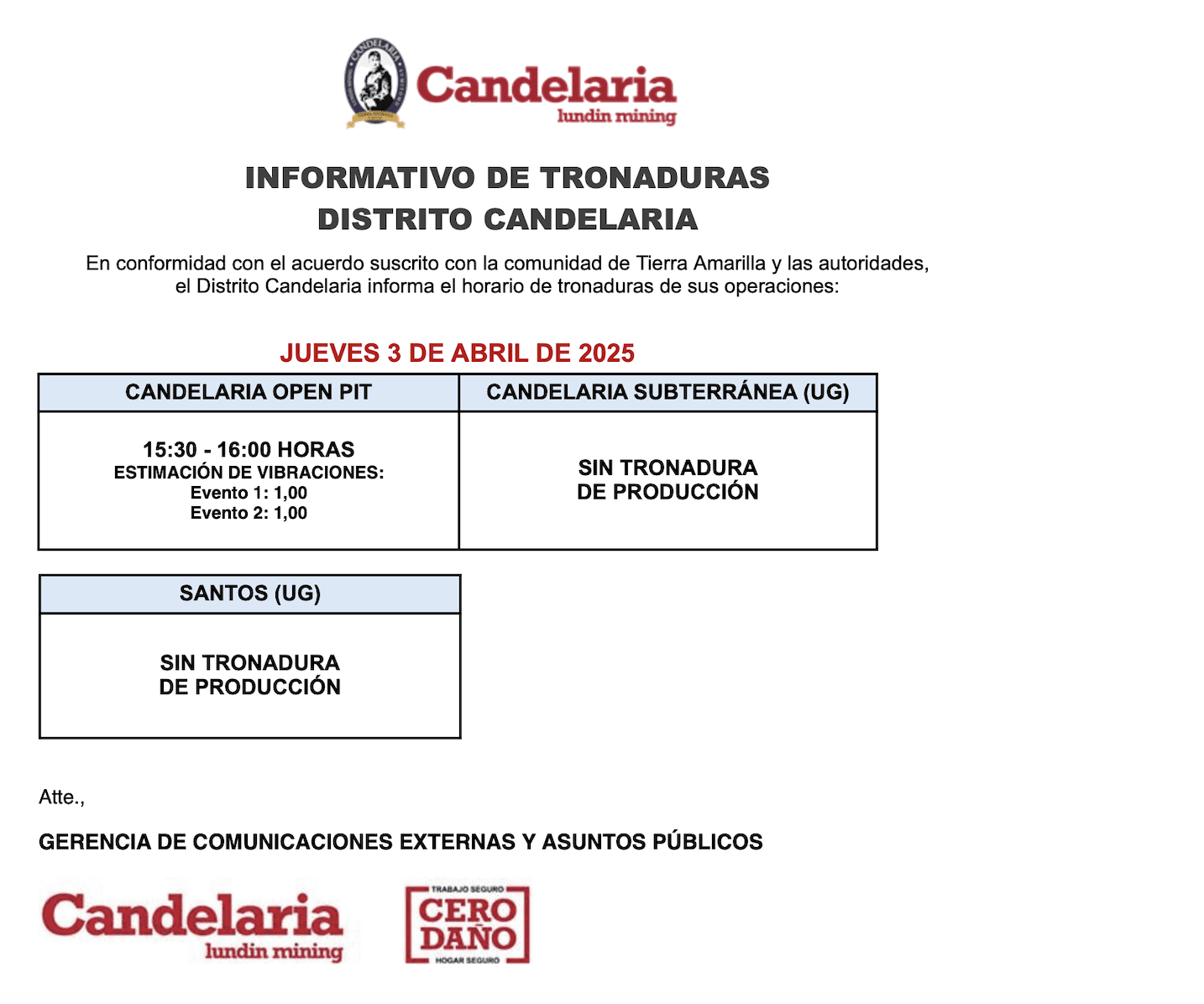 INFORMATIVO DE TRONADURAS DISTRITO CANDELARIA / JUEVES 3 DE ABRIL DE 2025
