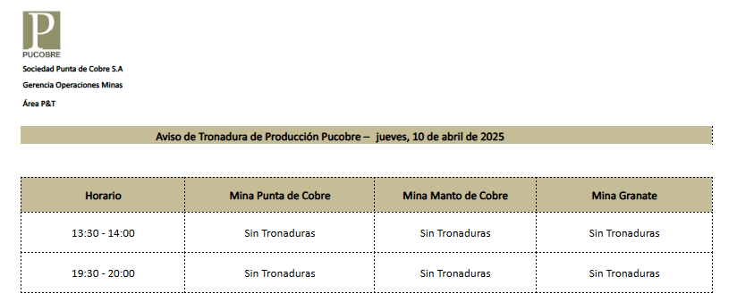 AVISO DE TRONADURAS DE PRODUCCIÓN PUCOBRE / JUEVES 10 DE ABRIL DE 2025