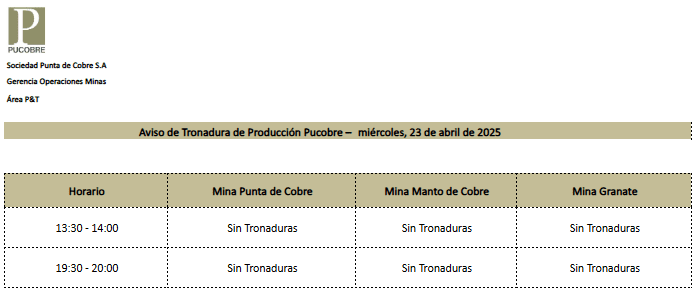 AVISO DE TRONADURAS DE PRODUCCIÓN PUCOBRE / MIÉRCOLES 23 DE ABRIL DE 2025