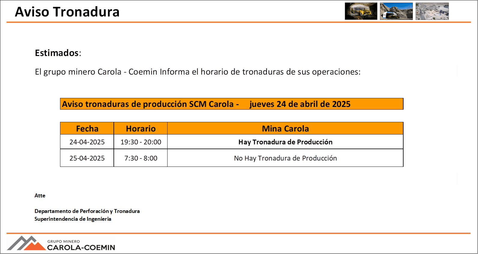 AVISO DE TRONADURAS DE PRODUCCIÓN SCM CAROLA / JUEVES 24 DE ABRIL DE 2025