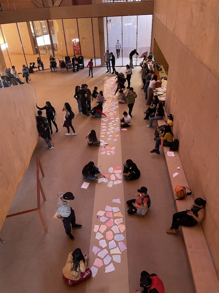 Durante la jornada, las y los asistentes realizaron un recorrido guiado por las nuevas instalaciones del Museo, donde conocieron los avances del proyecto museográfico. Posteriormente participaron en la presentación del proyecto mural “En Expansión” y además desarrollaron una actividad de creación basada en la técnica frottage, que les permitió explorar las formas y texturas del entorno museográfico, cuyos resultados se integraron en un gran collage colectivo realizado en la oportunidad como cierre simbólico del proceso creativo de la obra.