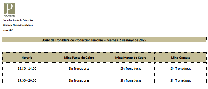 AVISO DE TRONADURAS DE PRODUCCIÓN PUCOBRE / VIERNES 2, SÁBADO 3 y DOMINGO 4 DE MAYO DE 2025