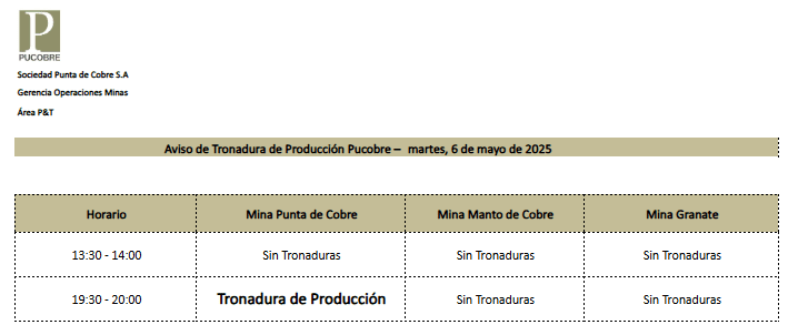 AVISO DE TRONADURAS DE PRODUCCIÓN PUCOBRE / MARTES 6 DE MAYO DE 2025