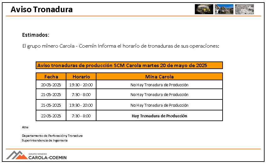 AVISO DE TRONADURAS DE PRODUCCIÓN SCM CAROLA / MARTES 20, MIÉRCOLES 21 y JUEVES 22 DE MAYO DE 2025