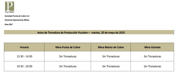AVISO DE TRONADURAS DE TRONADURAS DE PRODUCCIÓN PUCOBRE / MARTES 20 y MIÉRCOLES 21 DE MAYO DE 2025