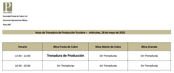 AVISO DE TRONADURAS DE PRODUCCIÓN PUCOBRE / MIÉRCOLES 28 DE MAYO DE 2025
