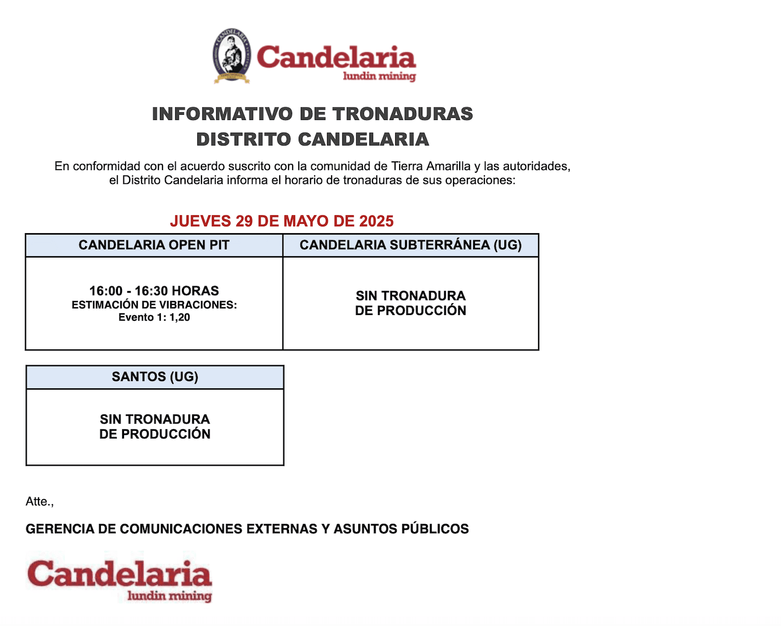 INFORMATIVO DE TRONADURAS DISTRITO CANDELARIA / JUEVES 29 DE MAYO DE 2025