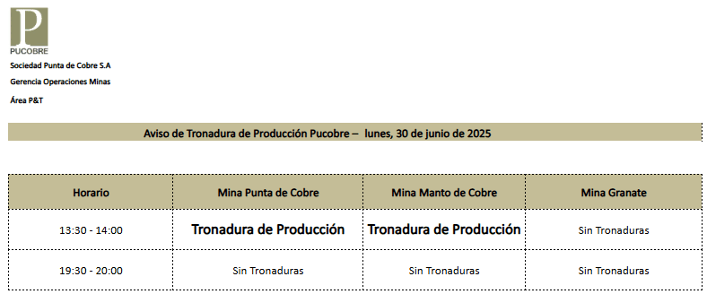 AVISO DE TRONADURAS DE PRODUCCIÓN PUCOBRE / LUNES 30 DE JUNIO DE 2025