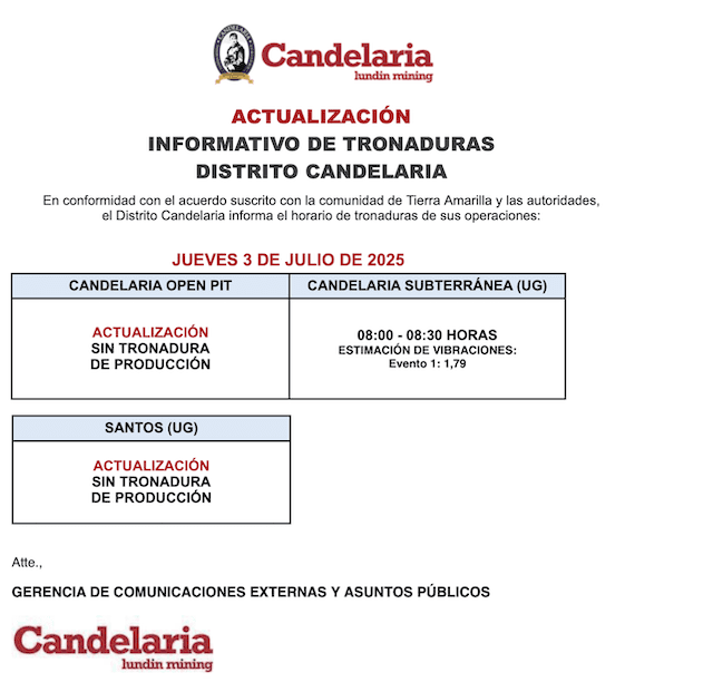 ACTUALIZACIÓN INFORMATIVO DE TRONADURAS CANDELARIA / JUEVES 3 DE JULIO DE 2025