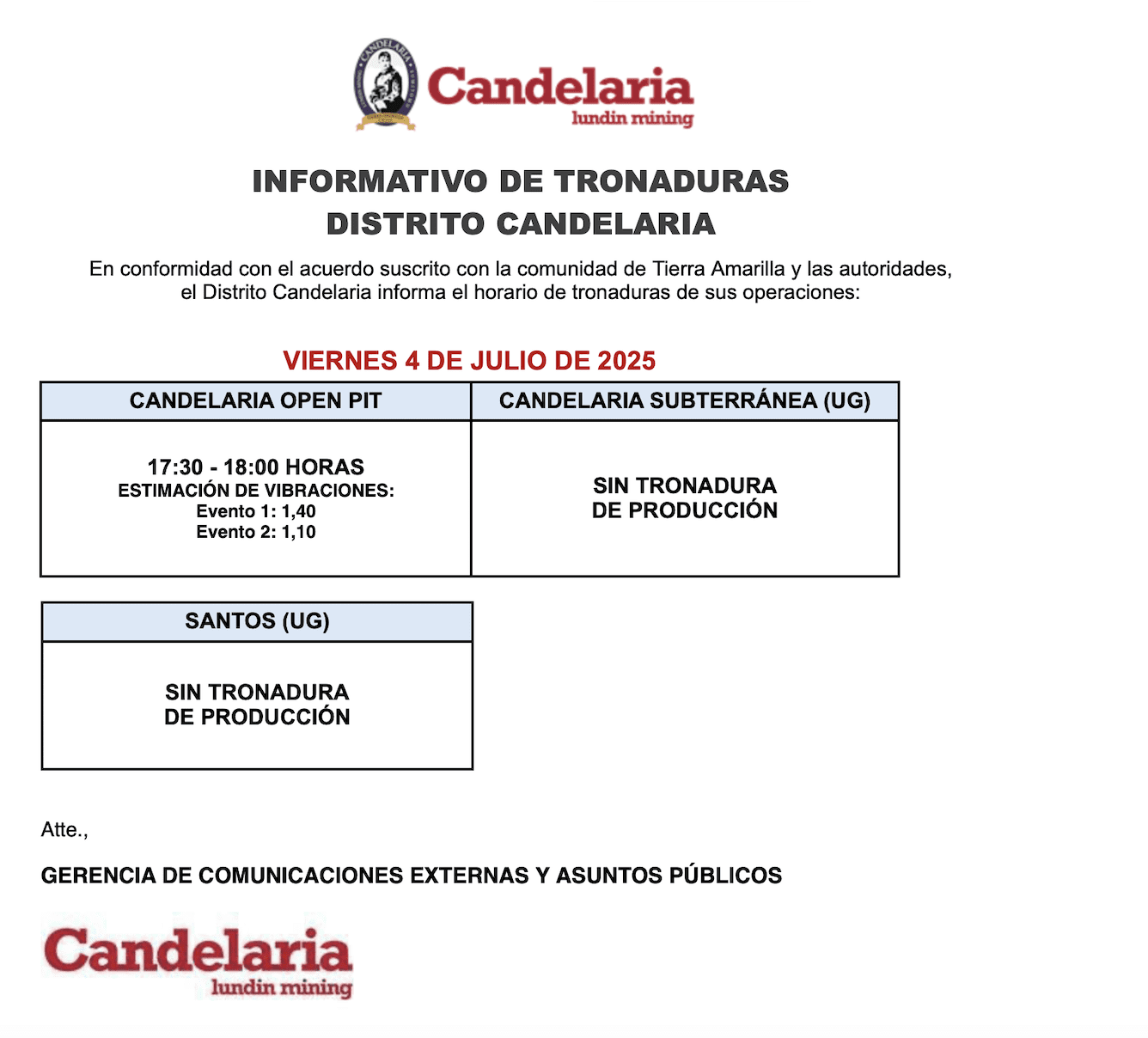 INFORMATIVO DE TRONADURAS DISTRITO CANDELARIA / VIERNES 4 DE JULIO DE 2025