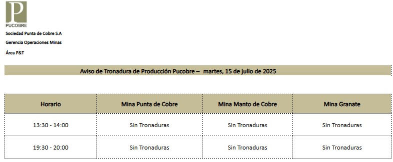 AVISO DE TRONADURAS DE PRODUCCIÓN PUCOBRE / MARTES 15 DE JULIO DE 2025