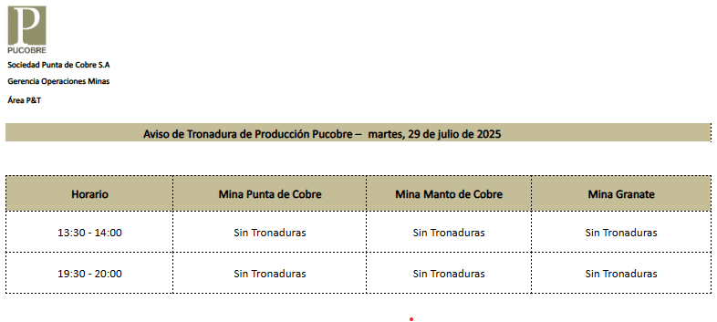 AVISO DE TRONADURAS DE PRODUCCIÓN PUCOBRE / MARTES 29 DE JULIO DE 2025