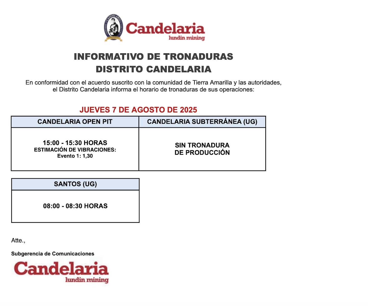 INFORMATIVO DE TRONADURAS DISTRITO CANDELARIA / JUEVES 7 DE AGOSTO DE 2025