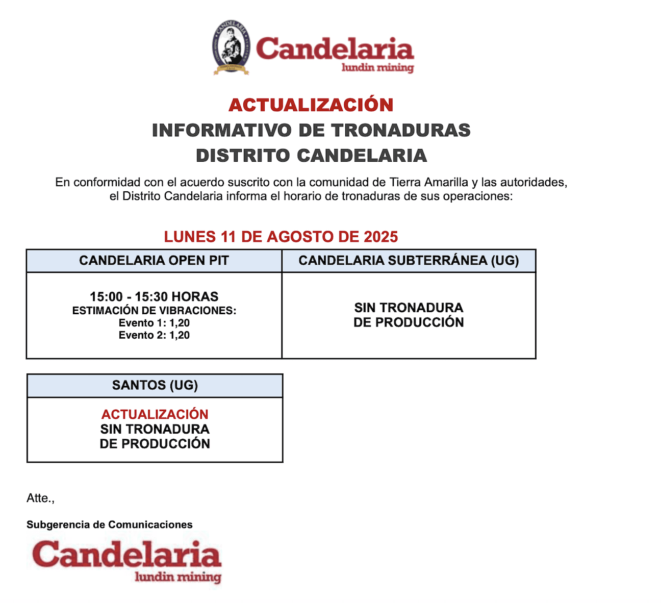 ACTUALIZACIÓN DE TRONADURAS CANDELARIA / LUNES 11 DE AGOSTO DE 2025