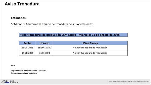 AVISO DE TRONADURAS DE PRODUCCIÓN SCM CAROLA / MIÉRCOLES 13 y JUEVES 14 DE AGOSTO DE 2025