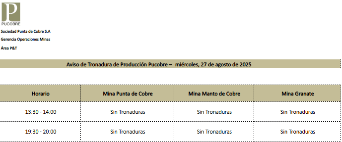 AVISO DE TRONADURAS DE PRODUCCIÓN PUCOBRE /JUEVES 28 DE AGOSTO DE 2025