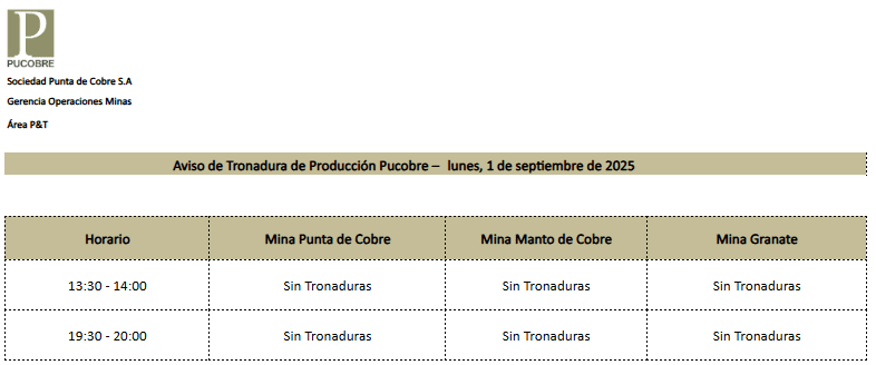 AVISO DE TRONADURAS DE PRODUCCIÓN PUCOBRE / LUNES 1 DE SEPTIEMBRE DE 2025