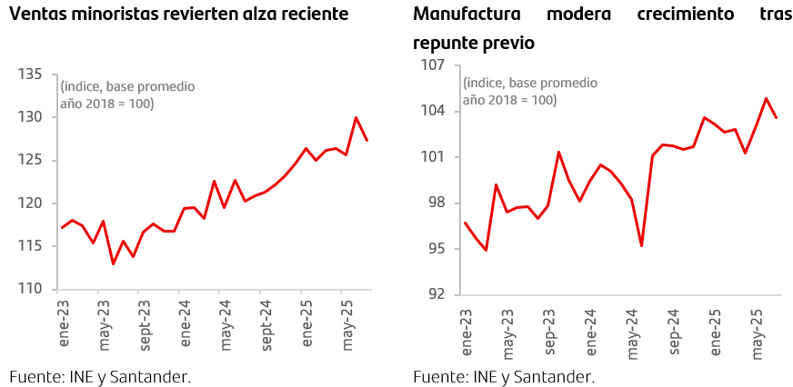 • El Índice de Actividad del Comercio al por Menor (IACM) creció 5,7% a/a, levemente por sobre las expectativas del mercado (Bloomberg: 5,5%; Santander: 5,8%). Este resultado fue impulsado por mayores ventas de productos electrónicos (+12,4% a/a), vestuario (+6,7%) y bienes de consumo diverso (+7,0% a/a). Sin embargo, en términos desestacionalizados, el indicador mostró una contracción mensual de 2,1% m/m, revirtiendo el fuerte avance registrado el mes anterior. En tanto, el índice de ventas de supermercados anotó un alza de 2,8% a/a y se mantiene relativamente plano en términos desestacionalizados.