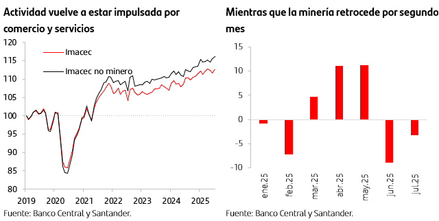 El Imacec de julio registró una expansión anual de 1,8%, en línea con lo esperado por el consenso del mercado (Bloomberg: 1,9%; Santander: 1,5%), pero con una variación mensual desestacionalizada de 1,0%, por sobre lo anticipado. El resultado anual fue impulsado, principalmente, por la mayor actividad en comercio y servicios, mientras que la minería, si bien cayó en términos anuales (-3,3%), mostró una recuperación en el margen (5,2% m/m).