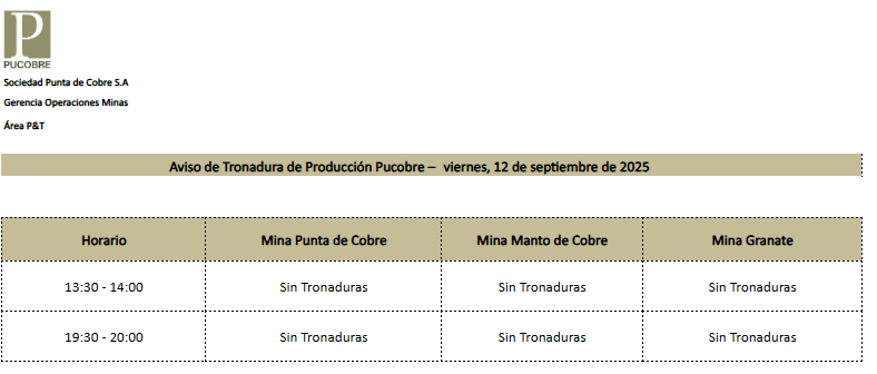 AVISO DE TRONADURAS DE PRODUCCIÓN PUCOBRE / SÁBADO 13 y DOMINGO 14 DE SEPTIEMBRE DE 2025
