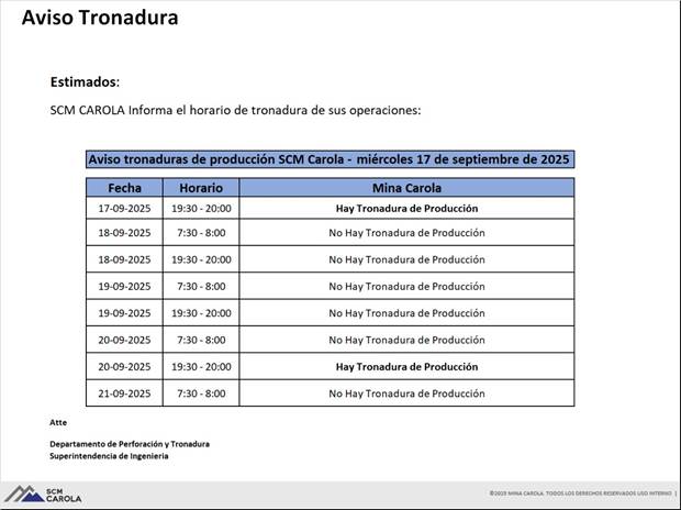 AVISO DE TRONADURAS DE PRODUCCIÓN SCM CAROLA / MIÉRCOLES 17, JUEVES 18, VIERNES 19, SÁBADO 20 y DOMINGO 21 DE SEPTIEMBRE DE 2025