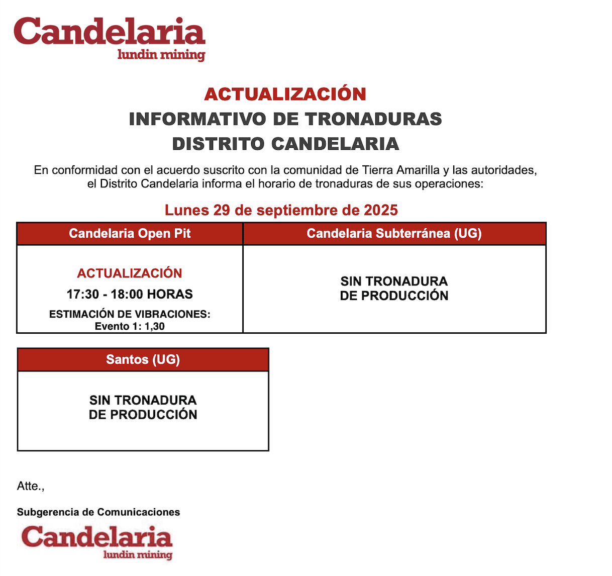 ACTUALIZACIÓN INFORMATIVO DE TRONADURAS CANDELARIA / LUNES 29 DE SEPTIEMBRE DE 2025