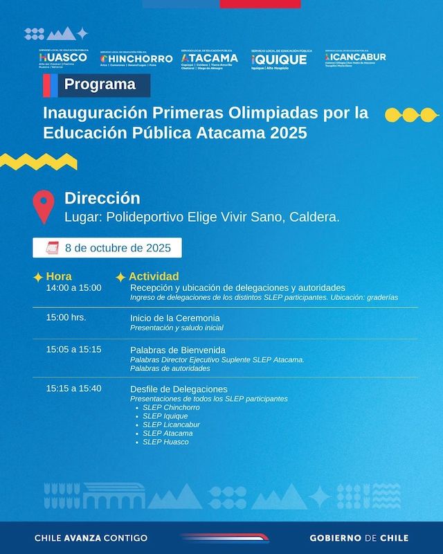 Con entusiasmo frente a una inédita fiesta deportiva estudiantil, el Servicio Local de Educación de (SLEP) Atacama invita a toda la comunidad educativa y a las familias a participar en la inauguración de las primeras Olimpiadas por la Educación Pública, un evento que une a cinco territorios educativos en una celebración deportiva, cultural y de fortalecimiento de la identidad pública.