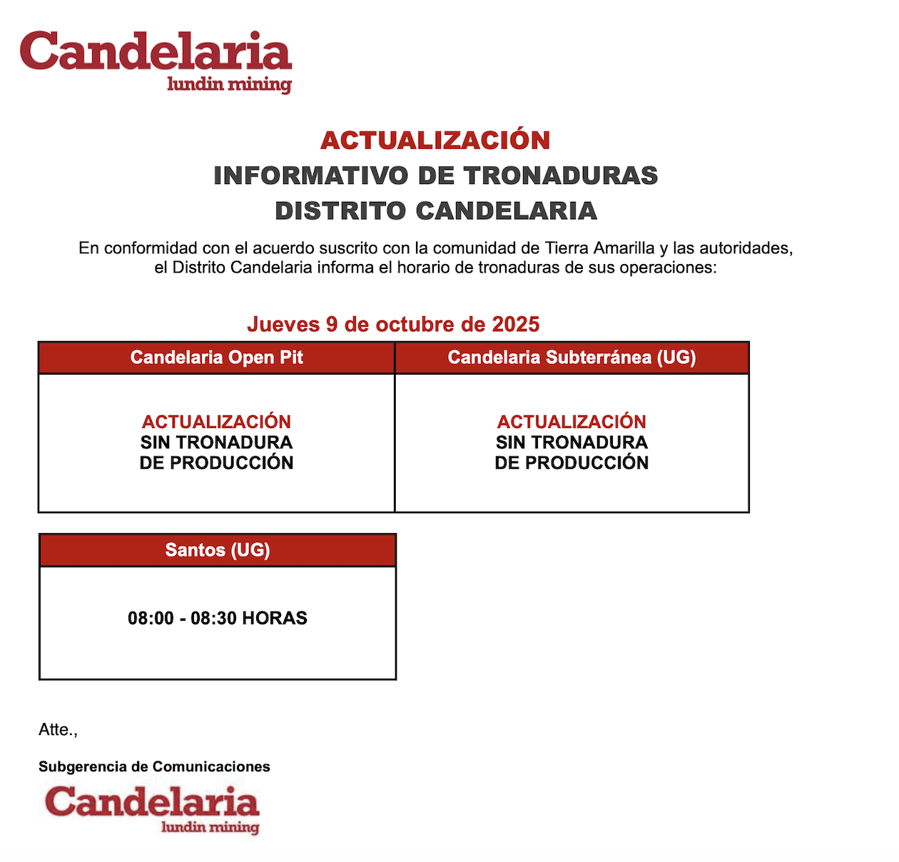 ACTUALIZACIÓN INFORMATIVO DE TRONADURAS CANDELARIA / JUEVES 9 DE OCTUBRE DE 2025