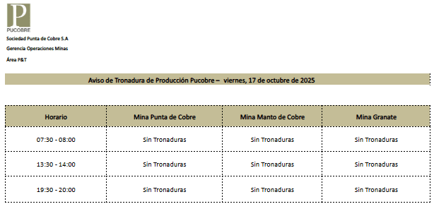 AVISO DE TRONADURAS DE PRODUCCIÓN PUCOBRE / JUEVES 16 DE OCTUBRE DE 2025