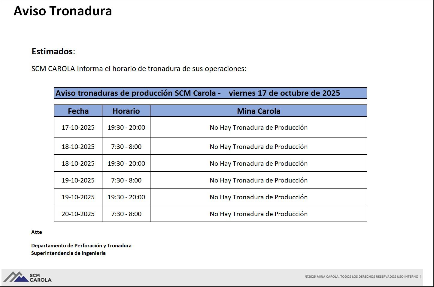AVISO DE TRONADURAS DE PRODUCCIÓN SCM CAROLA / VIERNES 17, SÁBADO 18, DOMINGO 19 y LUNES 20 DE OCTUBRE DE 2025