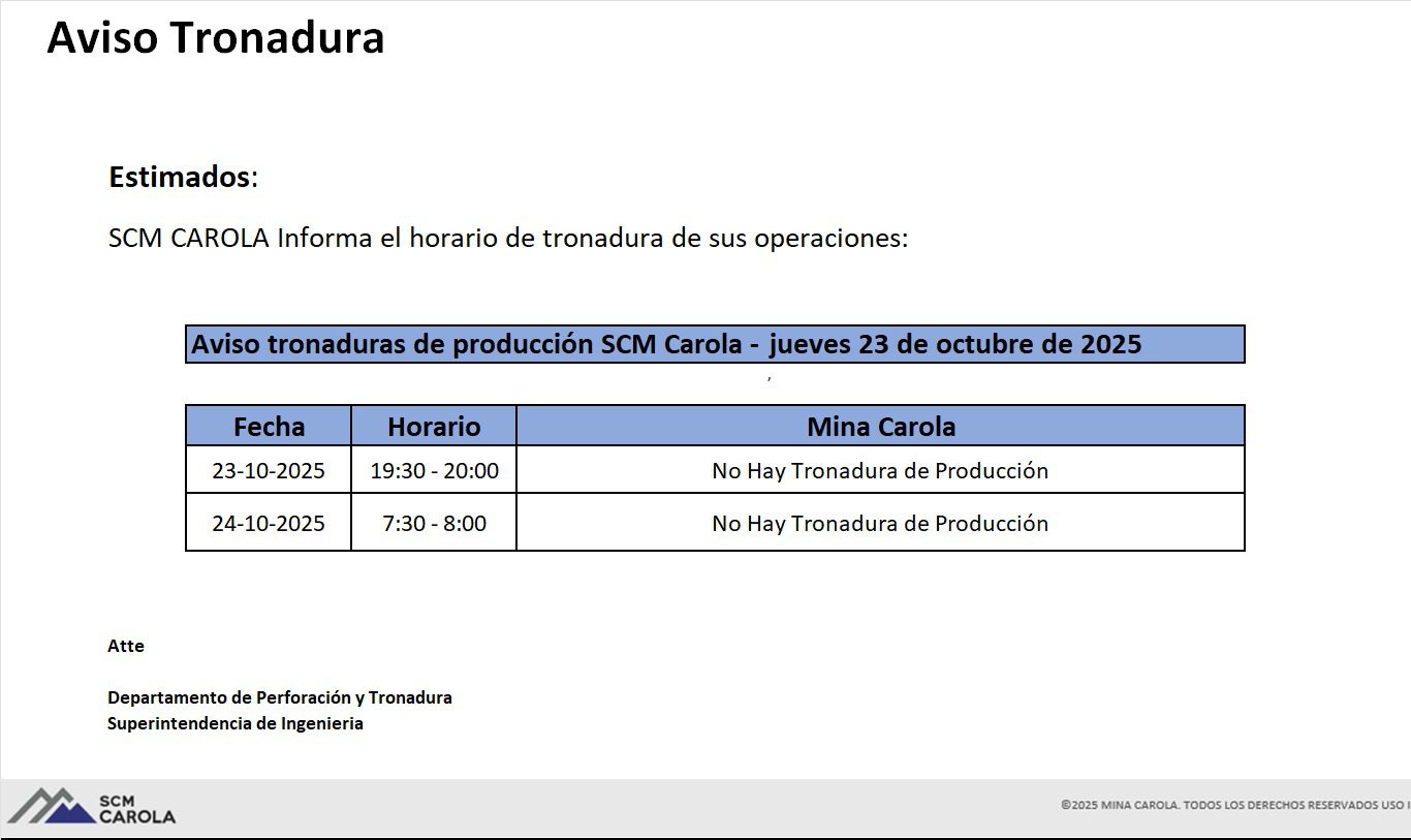 AVISO DE TRONADURAS DE PRODUCCIÓN SCM CAROLA / JUEVES 23 DE OCTUBRE DE 2025