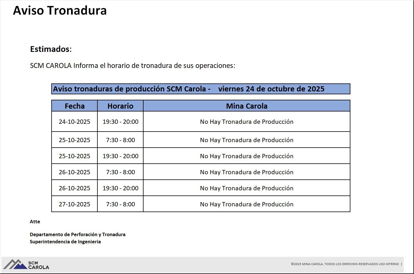 AVISO DE TRONADURAS DE PRODUCCIÓN SCM CAROLA / VIERNES 24, SÁBADO 25, DOMINGO 26 y LUNES 27 DE OCTUBRE DE 2025