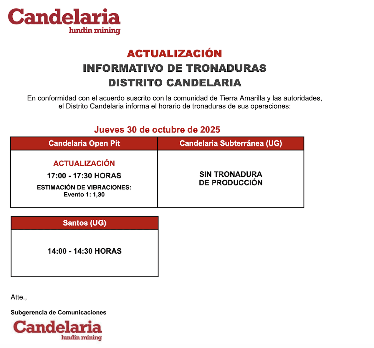 ACTUALIZACIÓN INFORMATIVO DE TRONADURAS CANDELARIA / JUEVES 30 DE OCTUBRE DE 2025