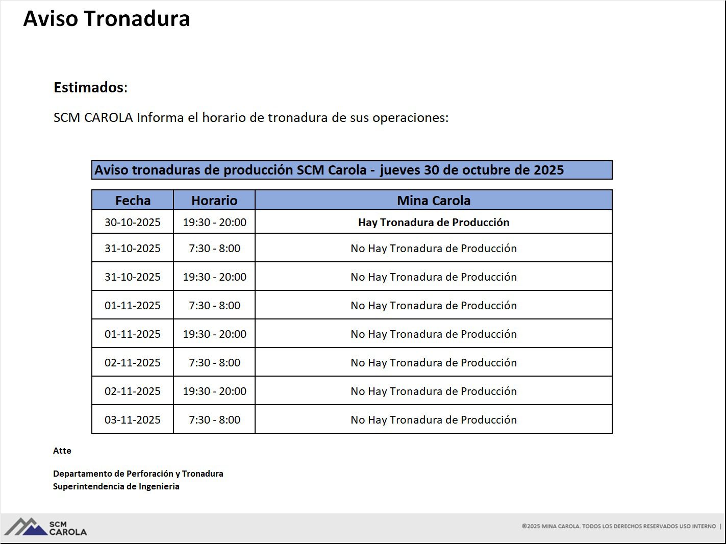 AVISO DE TRONADURAS DE PRODUCCIÓN SCM CAROLA / JUEVES 30, VIERNES 31 DE OCTUBRE, SÁBADO 1, DOMINGO 2 y LUNES 3 DE NOVIEMBRE DE 2025