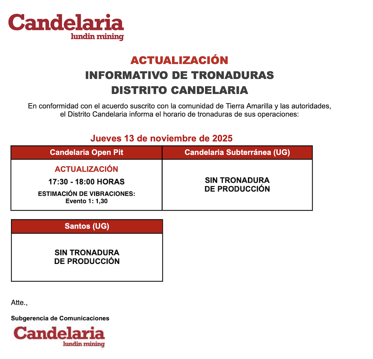 ACTUALIZACIÓN INFORMATIVO DE TRONADURAS CANDELARIA / JUEVES 13 DE NOVIEMBRE DE 2025
