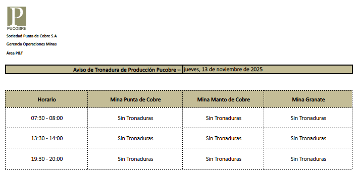AVISO DE TRONADURAS DE PRODUCCIÓN PUCOBRE / JUEVES 13 DE NOVIEMBRE DE 2025