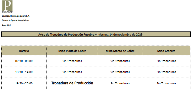 AVISO DE TRONADURAS DE PRODUCCIÓN PUCOBRE / VIERNES 14 , SÁBADO 15 y DOMINGO 16 DE NOVIEMBRE DE 2025