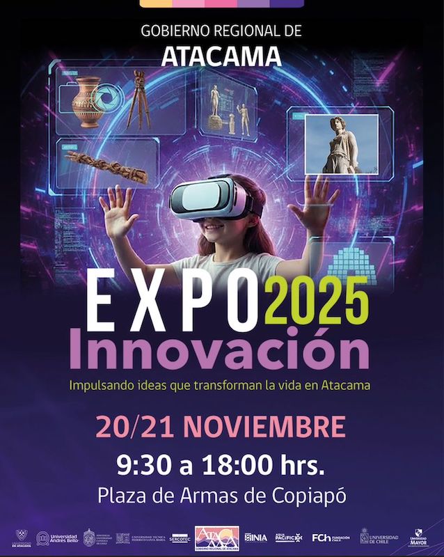 El Gobierno Regional de Atacama invita a toda la comunidad a ser parte de la Expo Innovación 2025, la principal muestra regional de ciencia, tecnología e innovación, que se llevará a cabo los días 20 y 21 de noviembre en la Plaza de Armas de Copiapó, entre las 10:00 y las 18:00 horas.