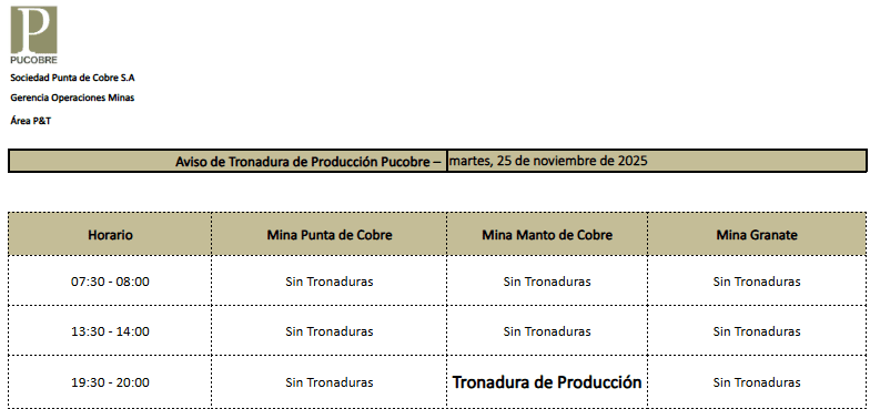 AVISO DE TRONADURAS DE PRODUCCIÓN PUCOBRE / MARTES 25 DE NOVIEMBRE DE 2025
