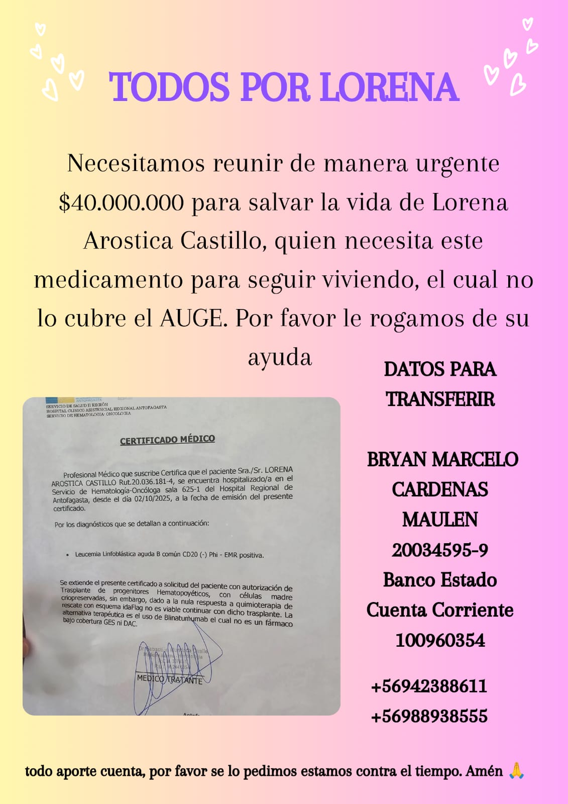 Un desgarrador llamado a la solidaridad y al sentimiento de humanidad para apoyar a su hija hizo la madre de Lorena Arostica  Castillo , una joven tierraamarillana de 26 años que enfrenta una compleja Leucemia Linfoblástica Aguda, un tipo de cáncer a la sangre que la mantiene hospitalizada en Antofagasta y cuyo tratamiento depende de un medicamento vital que el sistema de salud no cubre.A pesar de haber recibido múltiples quimioterapias y de haber resistido un tratamiento intensivo, Lorena ya no puede someterse a nuevas quimios. Su única esperanza es un trasplante de médula ósea, el cual ya está confirmado, gracias a que dos de sus hermanos resultaron compatibles y el procedimiento está listo para realizarse en Santiago. Sin embargo, hay un único impedimento que lo está deteniendo todo: El medicamento que puede salvar su vida.
