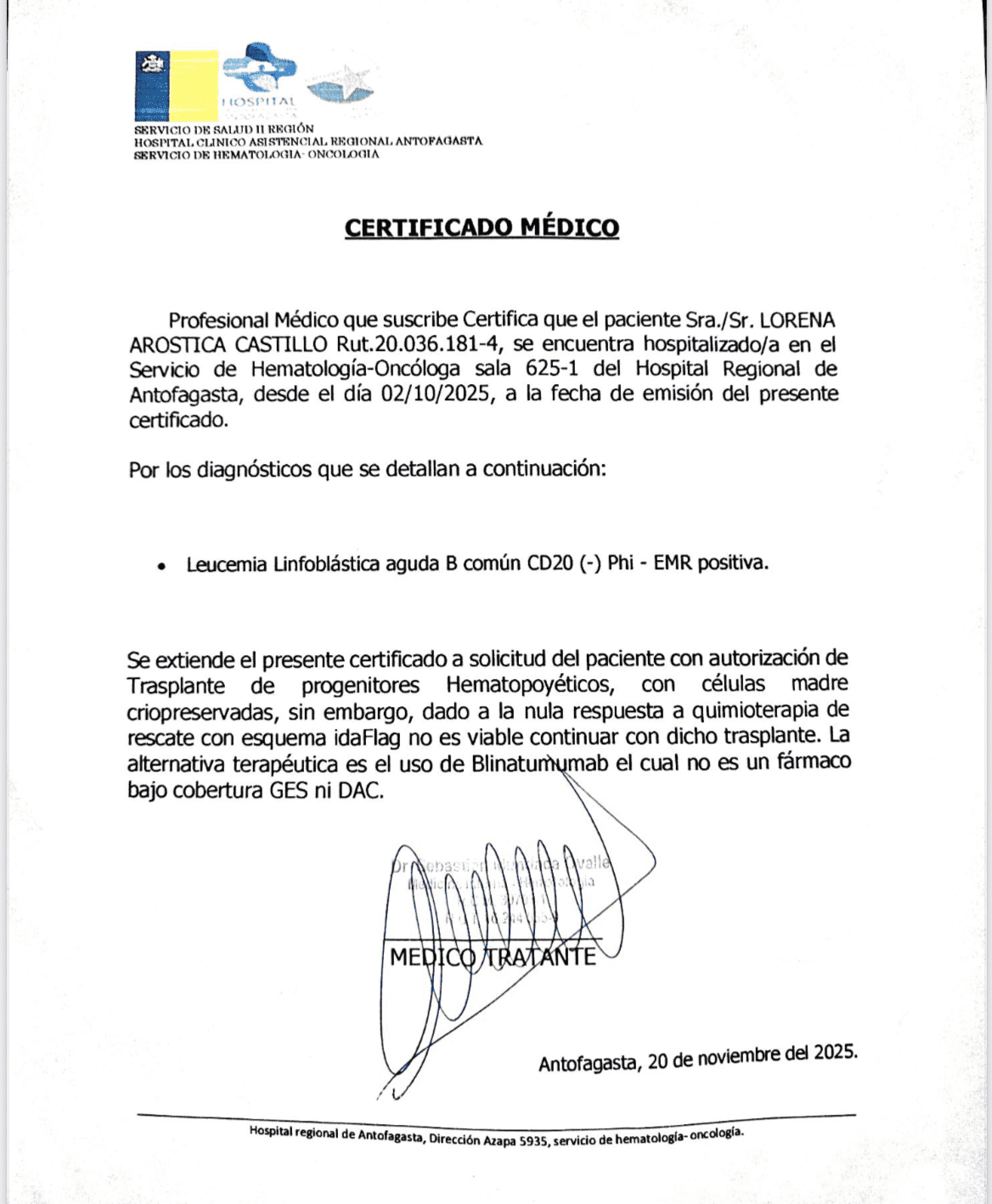 Para que el trasplante sea posible, Lorena debe recibir Blinatumumab, un medicamento de alto costo —aproximadamente 40 millones de pesos— indispensable para dejar su organismo en condiciones compatibles con el trasplante. Lamentablemente, este fármaco no está incluido en el AUGE/GES, por lo que el hospital no puede suministrarlo, y la familia debe costearlo por completo.