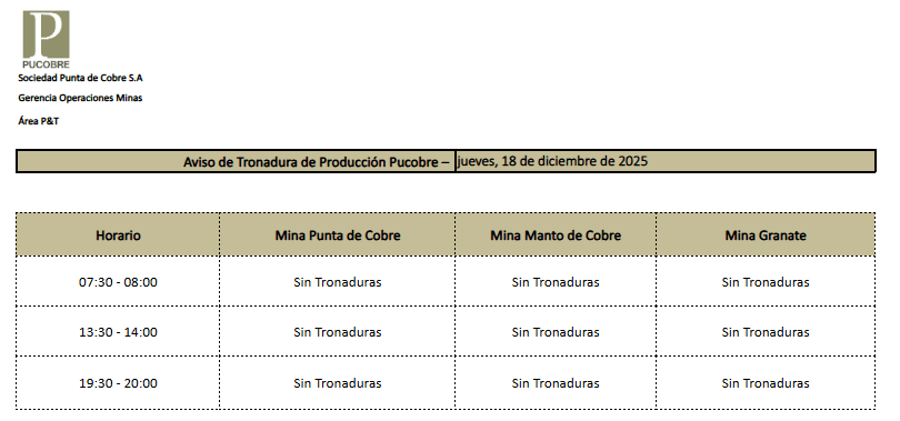 AVISO DE TRONADURAS DE PRODUCCIÓN PUCOBRE / JUEVES 18 DE DICIEMBRE DE 2025