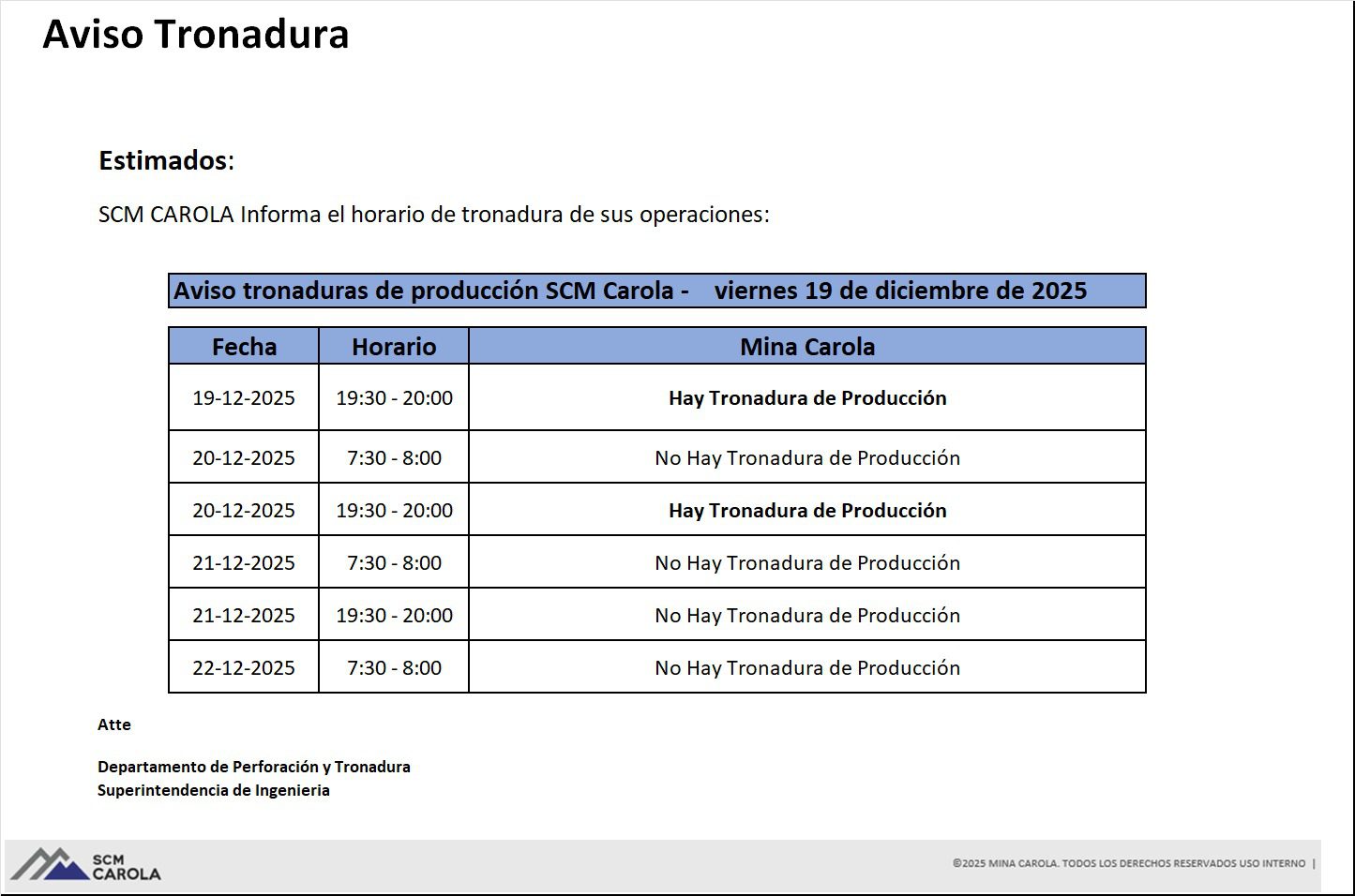 AVISO DE TRONADURAS DE PRODUCCIÓN SCM CAROLA / VIERNES 19, SÁBADO 20, DOMINGO 21 y LUNES 22 DE DICIEMBRE DE 2025